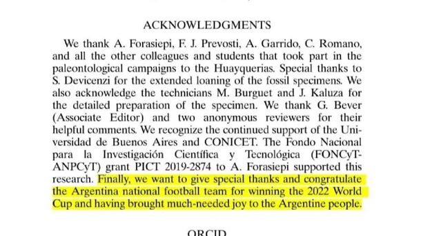 "El 20 de diciembre 2022, en pleno festejo mundialista, enviamos nuestro manuscrito, y el 30 de mayo 2023 finalmente salió publicado en la prestigiosa Journal of Vertebrate Paleontology nuestro más reciente trabajo, una nueva especie fósil de escuerzo", indicaron los especialistas al informar la noticia.