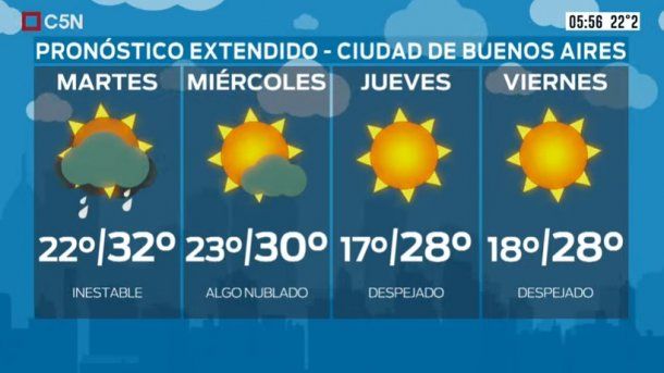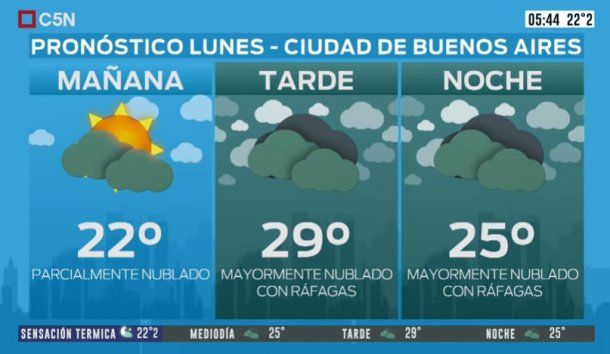 El Servicio Meteorológico Nacional (SMN) anticipa para la Ciudad de Buenos Aires un lunes con nubosidad en aumento y ráfagas de viento del Este. Se prevé cielo de parcial nublado a mayormente nublado y una temperatura de 22 grados de mínima y 29 grados de máxima.