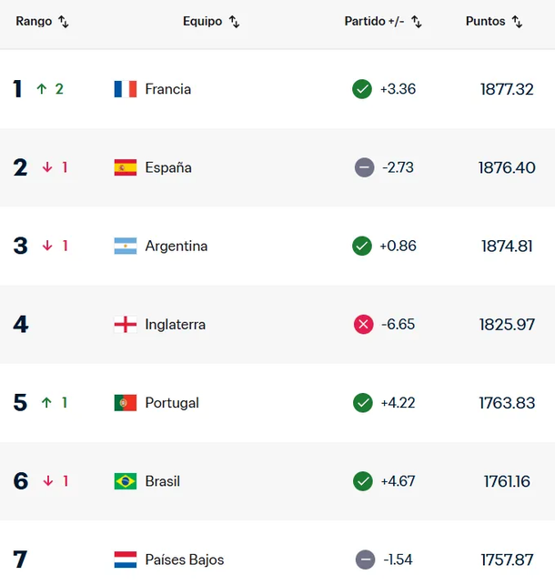 El nuevo líder del ranking es Francia, que aprovechó la oportunidad para escalar hasta la cima tras obtener resultados de peso en la última ventana internacional. El conjunto francés logró imponerse ante rivales de jerarquía como Brasil y Colombia, sumando una cantidad importante de puntos que le permitió superar tanto a españoles como a argentinos.