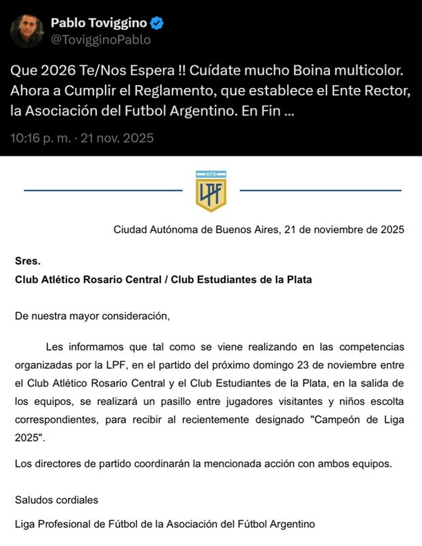 En medio de las versiones cruzadas, Estudiantes difundió un comunicado en el que aclaró: “En la reunión del Comité Ejecutivo de la Liga Profesional del Fútbol Argentino no se realizó ninguna votación respecto del reconocimiento del título de campeón de Liga 2025”. Pese al malestar, el club resolvió acatar el pedido y realizar el tradicional pasillo, tal como se acostumbra cuando un rival llega consagrado a un partido oficial.
