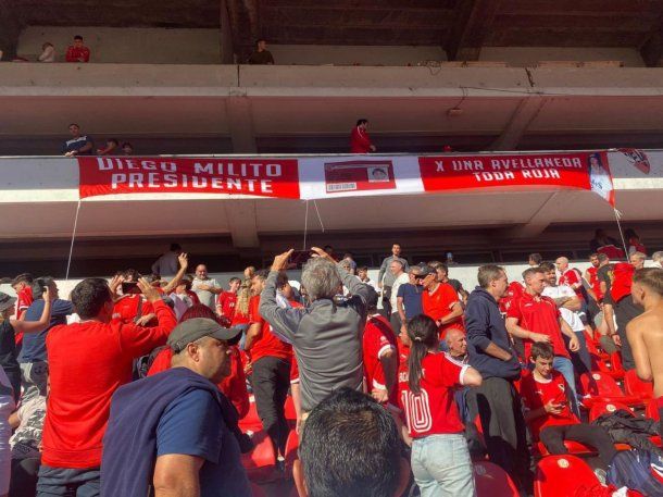 "Diego Milito, presidente. Por una Avellaneda toda roja", dice la bandera que apareció este domingo en una de las tribunas, con una vieja foto que le adjudican al exdelantero de Racing, en la que aparecería con la camiseta de Independiente.