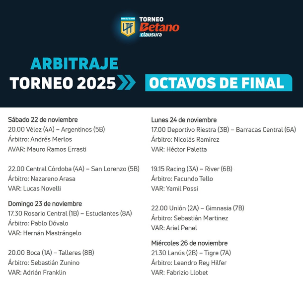 La Liga Profesional dio a conocer este jueves las designaciones arbitrales para los octavos de final del Torneo Clausura 2025, una instancia que comenzará este fin de semana y que tendrá varios duelos de alto voltaje.