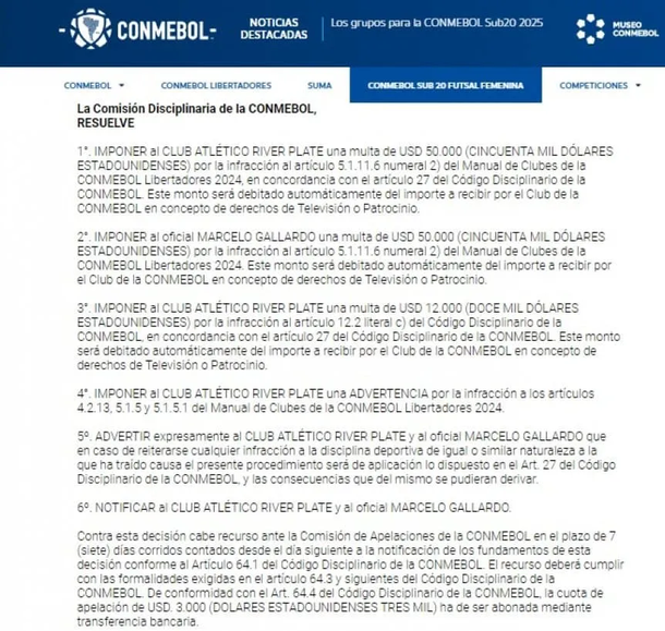 El ente madre del fútbol sudamericano advirtió que las sanciones se deducirán automáticamente de los ingresos que el club recibe por derechos de televisión o patrocinio. Además, se emitió una advertencia tanto a River como a Gallardo en caso de que se repitan infracciones de naturaleza similar en el futuro.