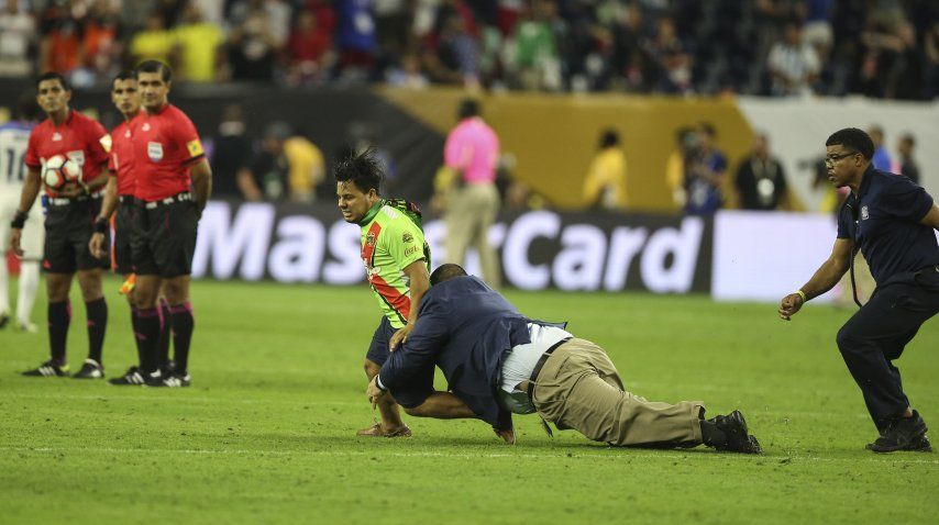 Tras su cometido, el hincha con la camiseta albiceleste fue perseguido por los hombres de seguridad quienes tardaron varios segundos hasta atraparlo.