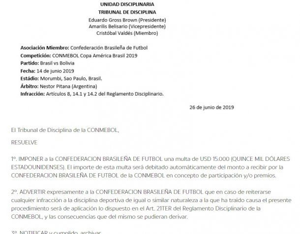 La Conmebol oficializó en las últimas horas la sanción que le impuso a la Confederación Brasileña de Fútbol por los cantos homofóbicos contra Carlos Lampe, arquero de Bolivia, durante el encuentro que abrió la Copa América 2019.