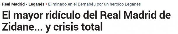 Por su parte, El Mundo señaló que "el Leganés abochorna a un Madrid en colapso y lo baja de la Copa"; mientras que en El País consideró que "se está empeñando el Real Madrid en aniquilar las esperanzas de quienes nunca dejamos de confiar en él, principalmente sus rivales y enemigos".