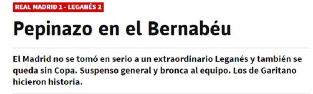 El diario Marca tituló en su portada "Gesta y bochorno", y calificó como " histórica" la clasificación del Leganés ante su triunfo por 2-1 en el estadio Santiago Bernabéu.