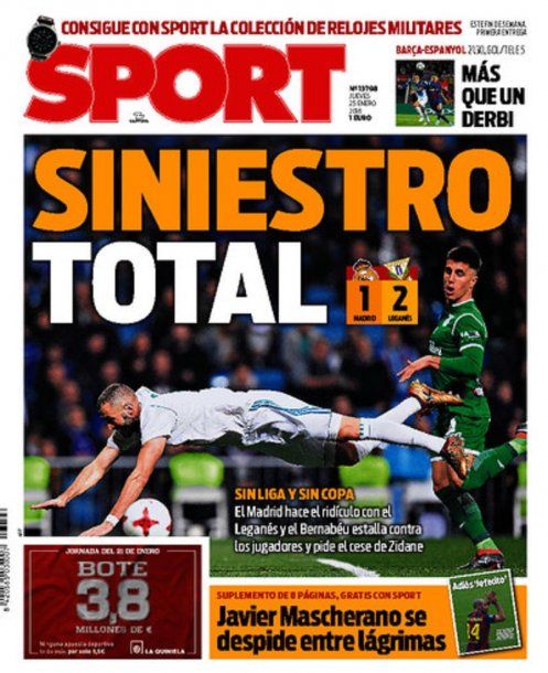 El periódico catalán SPORT, de Barcelona, fue muy duro en su titular: "Siniestro total", destaca en gran tipografía, y agrega que "sin Liga (ya que Real Madrid está a 19 puntos del líder, Barcelona) y sin copa, el Madrid hace el ridículo. El Bernabéu estalla contra los jugadores y pide el cese de Zidane".