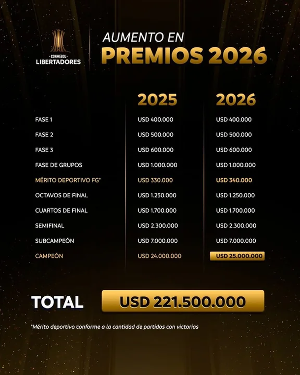 Además, el crecimiento económico de los torneos organizados por la CONMEBOL queda reflejado en el aumento del 439% en los premios entre 2015 y 2026. En comparación con la edición 2025, la suma total a repartir entre Libertadores y Sudamericana aumentará en USD 7.100.000.