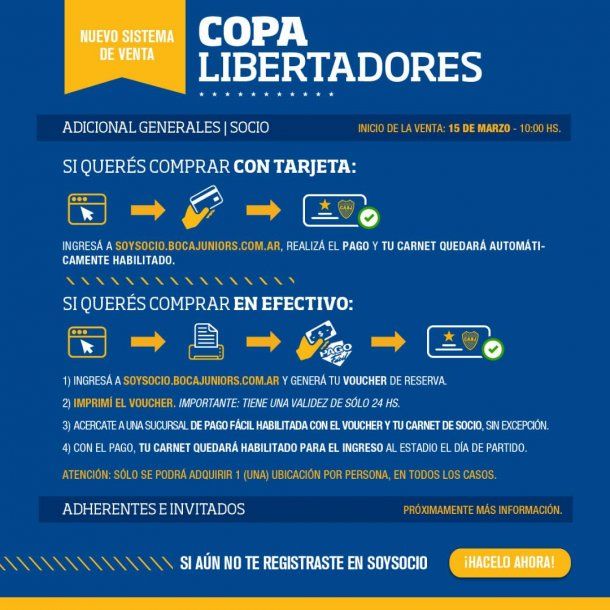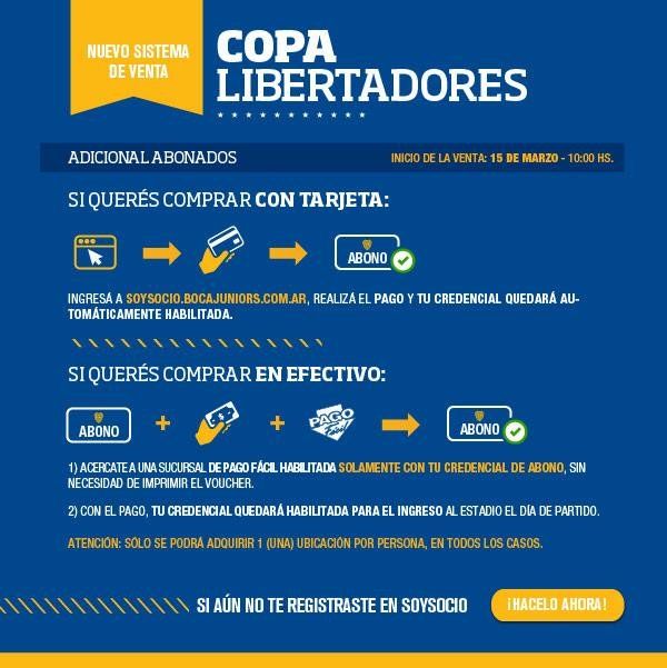 Desde esta edición de la Copa Libertadores en 2018, el trámite para adquirir Adicionales a generales para los partidos de Boca se canaliza exclusivamente desde soysocio.bocajuniors.com.ar.