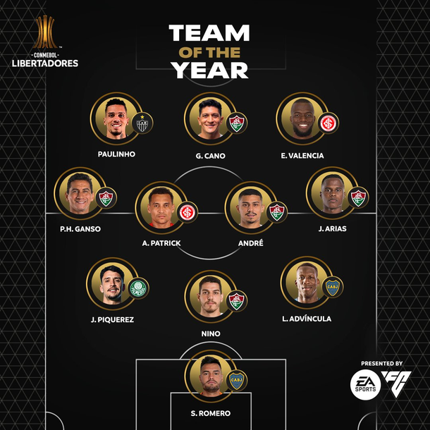 Sergio Romero; Luis Advíncula, Nino (Fluminense) y Joaquín Piquerez (Palmeiras); Jhon Arias (Fluminense), André (Fluminense), Alan Patrick (Inter) y Paulo Henrique Ganso (Fluminense); Enner Valencia (Inter), Paulinho (Atlético Mineiro) y Germán Cano (Fluminense).