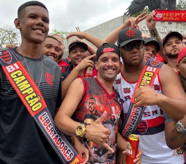 Una de las imágenes más llamativas de la partida del Flamengo de Brasil fue la que hizo sonreír a los hinchas de River más cabuleros, ya que mostraba a los fanáticos del Mengao luciendo cotillón que rezaba "Bicampeón", festejando por adelantado el título de la final que se jugará el sábado en la capital peruana.