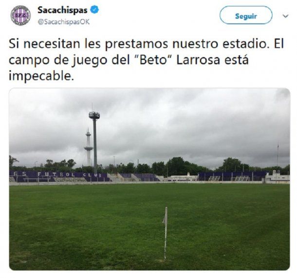 Irónicamente, desde la cuenta oficial de Sacachispas bromearon por el mal estado de la cancha de Boca: “Si necesitan les prestamos nuestro estadio. El campo de juego del ‘Beto’ Larrosa está impecable”.