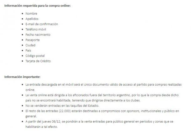 La entrada descargada en el móvil será el único documento válido de acceso al partido para compras realizadas online.La venta online está dirigida a los aficionados fuera del territorio argentino, por lo que la compra desde dicho país no se encontrará habilitada, teniendo que dirigirse directamente a los clubes.No se venderán entradas en las taquillas del Estadio.