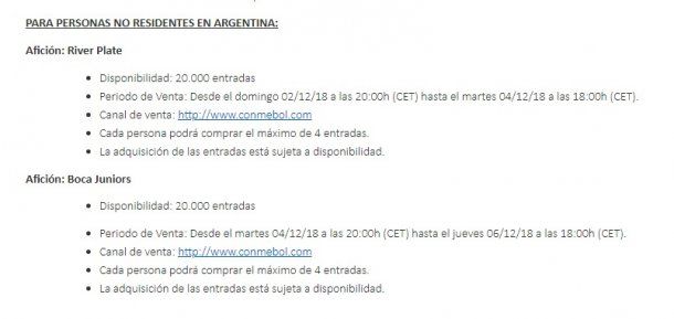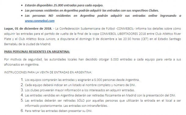 “Las entradas vendidas en Argentina deberán ser retiradas físicamente en Madrid con la presentación del DNI”, alertó Conmebol. Y agregó: “Las entradas deberán ser retiradas SÓLO por aquellas personas que utilizarán la entrada en el local a ser informado posteriormente. Las entradas son intransferibles”.