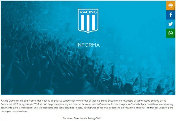 “Racing Club informa que, frente a los hechos de público conocimiento referidos al caso de Bruno Zuculini y en respuesta al comunicado emitido por la Conmebol el 23 de agosto de 2018, el club ha presentado hoy un recurso de reconsideración contra lo resuelto por la Conmebol por considerarlo arbitrario y agraviante para la institución. En este escenario que consideramos injusto, Racing Club se reserva el derecho de recurrir al Tribunal Arbitral del Deporte para proseguir con el reclamo”, sentencia el escueto comunicado que el club de Avellaneda publicó en su sitio oficial.