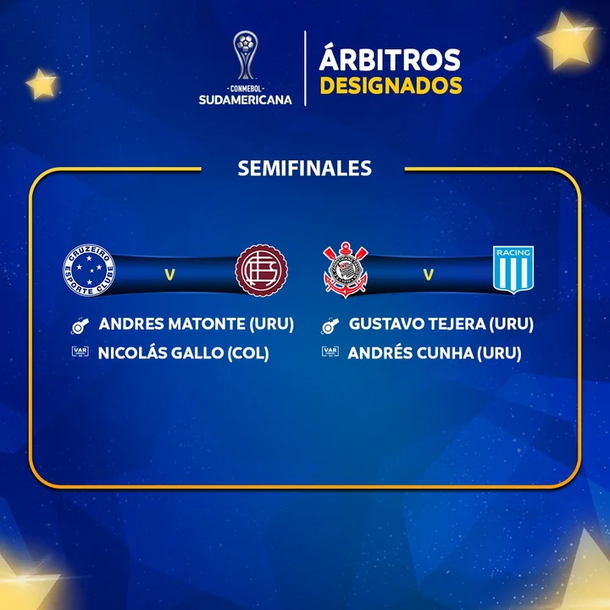 Racing visitará a Corinthians en Sao Paulo en la otra semifinal de la Sudamericana. Para este duelo, la Conmebol ha designado al también uruguayo Gustavo Tejera como árbitro principal. Tejera tendrá la responsabilidad de mediar entre dos equipos que buscan llegar a la final y levantar el trofeo.