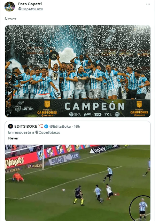 La cosa no quedó ahí, porque Enzo luego mantuvo otro cruce en las redes sociales. Una cuenta de Twitter se burló por el penal que Franco Armani le pató a Galván, para privar a Racing del título, y el goleador retuiteó con una foto de la consagración del Trofeo de Campeones.