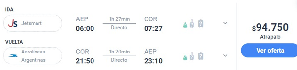 Una pasaje de ida y vuelta para el mismo domingo, puede desde $95.000 a $140.000. Lo que tiene a favor esta opción es que no hay que gastar más dinero en hospedaje ya que podría llegar a las 7 de la mañana a Córdoba y emprender el regreso a Buenos Aires a las 23 una vez finalizado el encuentro y con mucho tiempo para prepararse. El tiempo aproximado de vuelo es de 1 hora y media.