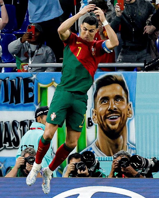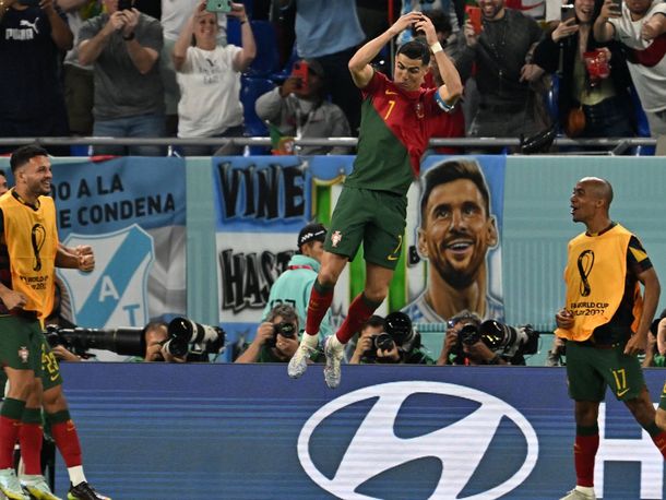 El partido entre Portugal y Ghana en la Copa del Mundo iba 0-0 cuando Mohammed Salisu pareció cometerle una falta a Cristiano Ronaldo, que cayó en el área. El árbitro Ismail Elfath sancionó un discutido penal y el Bicho lo cambió por gol. Al festejar, corrió hacia el lateral izquierdo, sector en el que había varias banderas argentinas. Entre ellas, una tenía el rostro sonriente de Lionel Messi, que fue espectador privilegiado de la celebración de CR7.