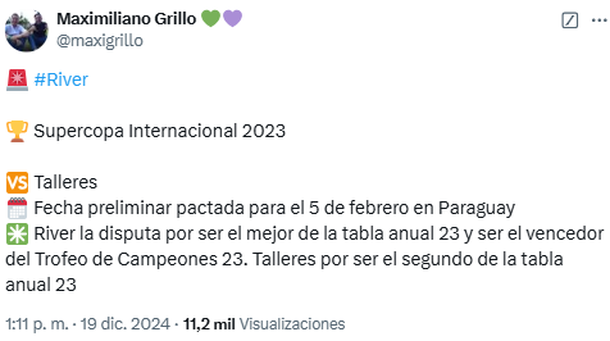 De acuerdo con el periodista Maximiliano Grillo, el enfrentamiento entre el campeón de la Liga Profesional 2023, River, y el subcampeón de la Copa Argentina, Talleres, podría disputarse el próximo miércoles 5 de febrero en Paraguay. Sin embargo, la información todavía no fue oficializada por la Asociación del Fútbol Argentino (AFA), encargada de confirmar el cronograma definitivo. El estadio elegido para este duelo sería el Defensores del Chaco o La Nueva Olla, ambos ubicados en Asunción, y se jugaría en horario nocturno.