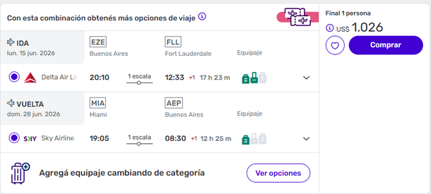 Diagramando una experiencia con base en Miami, una ciudad conocida por los habitantes de nuestro país, el promedio de un vuelo es de 1026 dólares viajando en Delta Air Lines y regresando con Sky Airline. El viaje de ida tendrá una duración de 17 horas y 23 minutos con una escalada en Atlanta. Además, la persona que elija esta opción podrá despachar una valija y llevar un equipaje de mano para mayor comodidad. Para la vuelta, el regreso será de 12 horas y 25 minutos y tendrá una pequeña bajada en Lima.