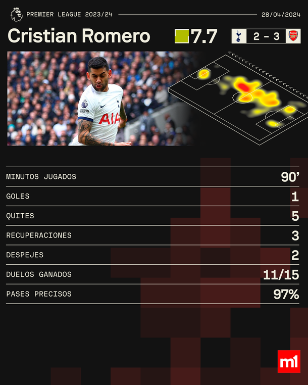 LOS NÚMEROS DEL CUTI ROMERO EN LA DERROTA DEL TOTTENHAM