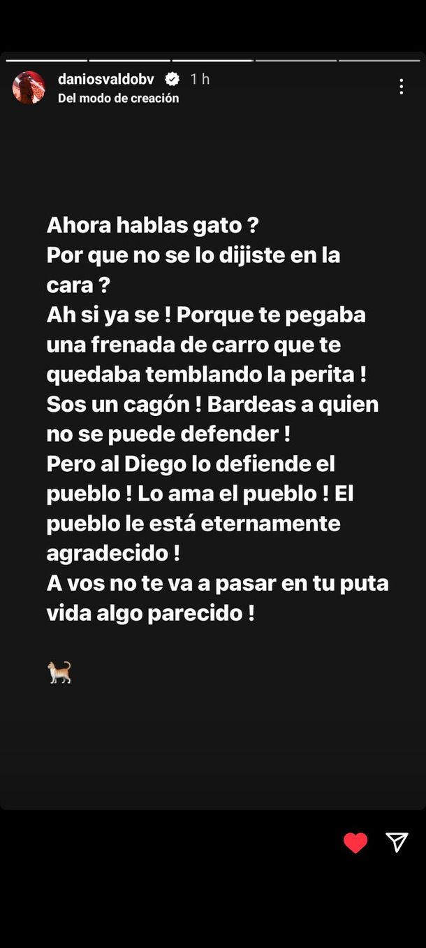 "Por qué no se lo dijiste en lam cara? Ah si! ya sé, porque te pegaba una frenada de carro que te quedaba temblando la perita. Sos un cagón, bardeas a quien no se puede defender. Pero al Diego lo defiende el pueblo. El pueblo le está eternamente agradecido. A vos no te va a pasar en tu puta vida algo parecido!", sentenció en referencia a los dichos del expresidente.