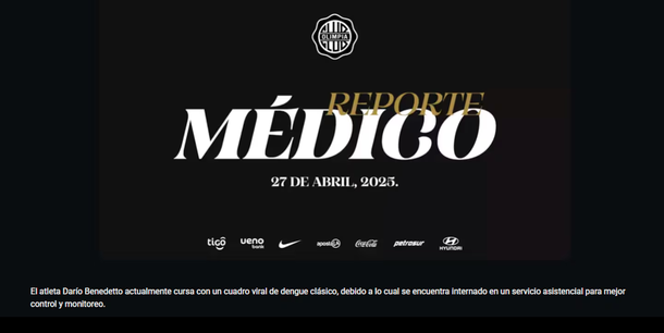 El dengue, transmitido por la picadura del mosquito Aedes aegypti, viene generando numerosos casos en Paraguay y también en varias regiones de Sudamérica en los últimos meses, lo que obliga a extremar precauciones. Desde el club pidieron paciencia y enviaron fuerzas al delantero en este difícil momento.