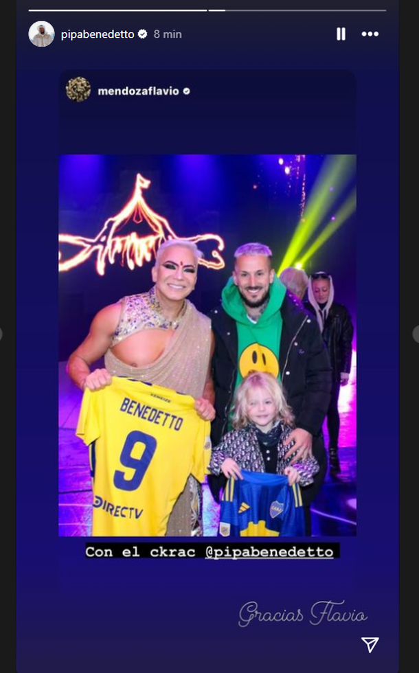 La controversia surgió cuando Benedetto compartió una foto en Instagram posando con el bailarín y su hijo Dionisio, a quienes les regaló una camiseta firmada. Mendoza agradeció el gesto con la leyenda: "Con el crack".