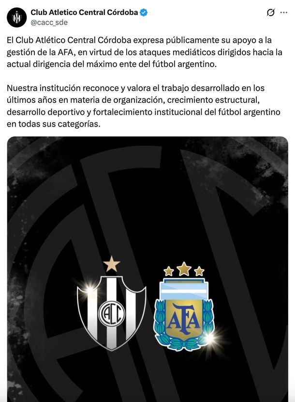 "El Club Atlético Central Córdoba expresa públicamente su apoyo a la gestión de la AFA, en virtud de los ataques mediáticos dirigidos hacia la actual dirigencia del máximo ente del fútbol argentino. Nuestra institución reconoce y valora el trabajo desarrollado en los últimos años en materia de organización, crecimiento estructural, desarrollo deportivo y fortalecimiento institucional del fútbol argentino en todas sus categorías", escribió el conjunto santiagueño.