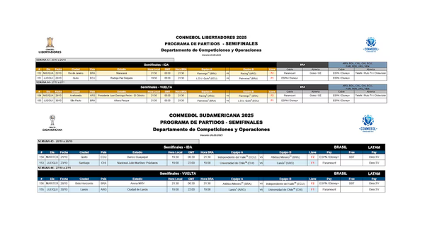 La Confederación Sudamericana de Fútbol (CONMEBOL) puso fin a la incertidumbre y oficializó las fechas y horarios de las semifinales de la Copa Libertadores y de la Copa Sudamericana 2025. El anuncio organiza el camino hacia las finales de los torneos más importantes del continente, donde dos equipos argentinos sueñan con la gloria: Racing en la Libertadores y Lanús en la Sudamericana.