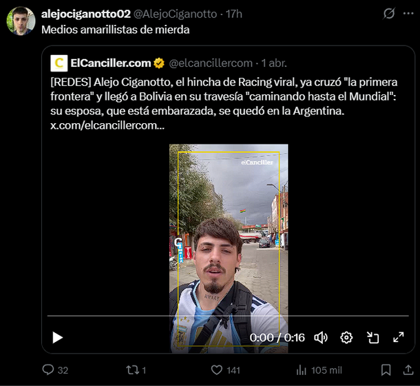 La presión fue tal que Ciganotto decidió ponerle fin a su recorrido: “Voy a ver el partido de Racing en Sucre y después vuelvo a Argentina. Se terminó el viaje, no puedo mentalmente después de ver esto”, expresó, visiblemente afectado por la situación que se generó en torno a su historia.