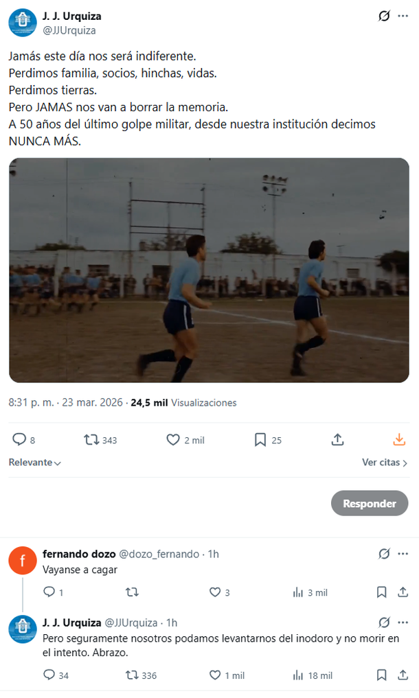 Todo comenzó cuando la cuenta oficial del club (@JJUrquiza) publicó un fuerte y sentido comunicado institucional recordando a las víctimas del terrorismo de Estado vinculadas a la institución: "Jamás este día nos será indiferente. Perdimos familia, socios, hinchas, vidas. Perdimos tierras. Pero JAMAS nos van a borrar la memoria. A 50 años del último golpe militar, desde nuestra institución decimos NUNCA MÁS."