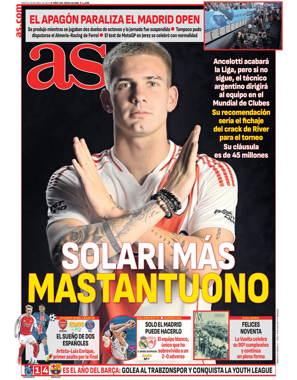 "Solari más Mastantuono", tituló el prestigioso diario AS en la tapa que saldrá este martes, y que lo tiene en primer plana al joven mediocampista de 17 años que, al parecer, ya despierta el interés de los clubes más importantes del mundo.