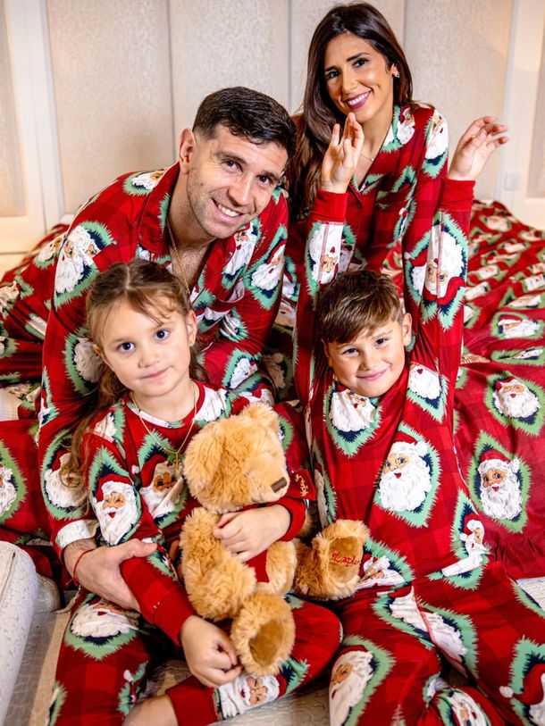 A través de sus redes sociales, compartió una imagen junto a su esposa y sus hijos que no tardó en llamar la atención de sus seguidores. En la postal, toda la familia aparece vestida con un pijama enterizo idéntico, de color rojo intenso, decorado con figuras de Papá Noel y los clásicos motivos navideños en tonos verdes y blancos.