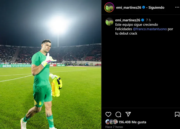 El arquero campeón del mundo utilizó su cuenta oficial de Instagram para dedicarle unas palabras al joven talento surgido en el Millonario. "Este equipo sigue creciendo. Felicidades Franco Mastantuono por tu debut, crack", escribió Dibu, acompañado por una imagen del grupo tras el triunfo.