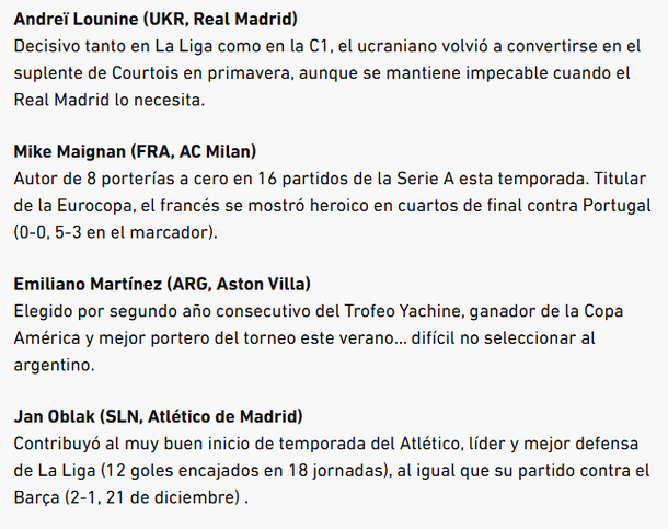 En el análisis del medio francés, también se resaltó que la posición de arquero sigue siendo dominada por jugadores con experiencia, ya que 7 de los 10 nominados tienen más de 30 años: en este contexto, Martínez, a sus 32 años, encabeza una lista que incluye nombres de renombre en el fútbol europeo y mundial.