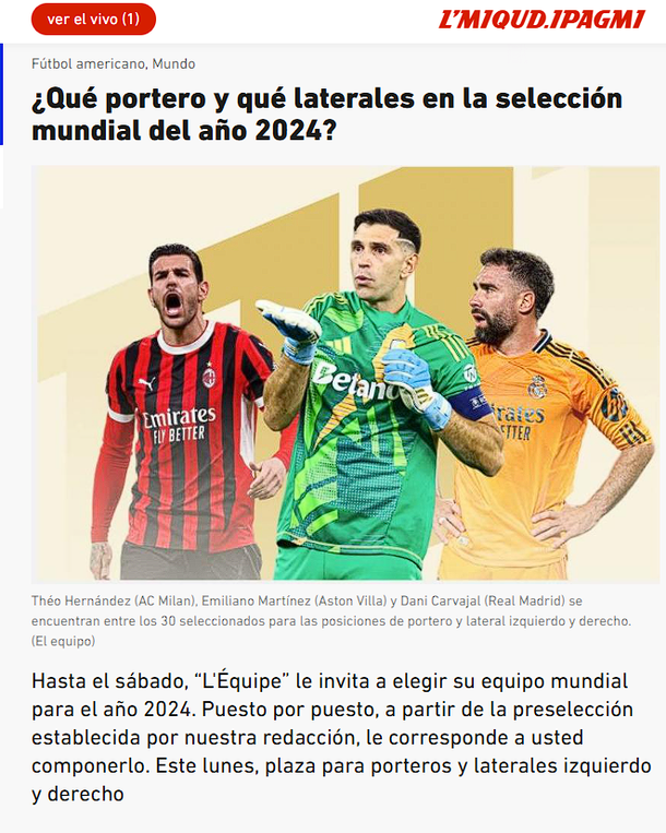Emiliano "Dibu" Martínez reafirmó su lugar como el mejor arquero del mundo al ser incluido en la preselección para el XI ideal de 2024 por el prestigioso diario francés L’Equipe, un medio que ha tenido varios exabruptos contra el portero y el país, tras la derrota de Les Bleus ante la Scaloneta en la final del Mundial de Qatar 2022.