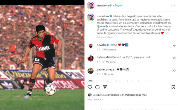 La cuenta del 10, que en esta momento es manejada por sus herederos (principalmente por Dalma y Gianinna) posteó una imagen de aquel 10 de octubre de 1992: "Un día como hoy debutabas oficialmente en Newell's contra Independiente. Gracias a los leprosos por el cariño constante. Y al club que, junto con Argentinos y el 'Lobo', son los que más te recuerdan en sus redes".