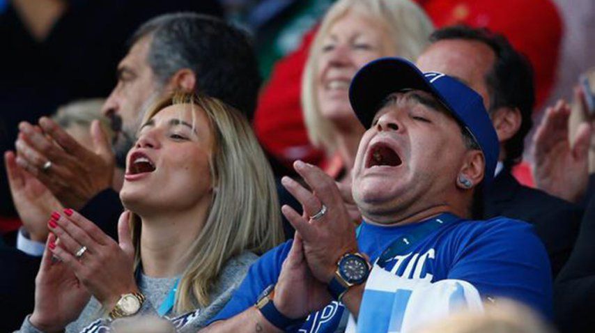 Ya en el estadio y al momento del Himno, "Diego" lo entonó serio, mientras la televisión oficial de la Copa del Mundo lo enfocaba en primer plano. Cuando terminò la canción patria "albiceleste" el crack cerró el puño de su mano derecha, lo que hizo delirar al público en el estadio de Leicester.