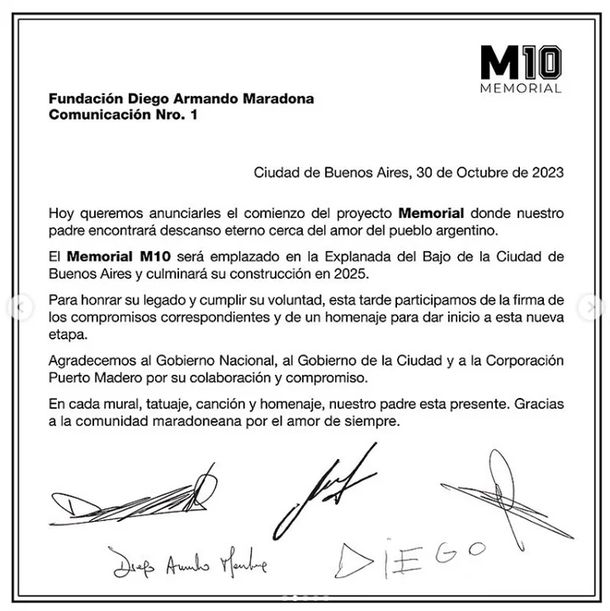 Los herederos del “10” a través de redes sociales comunicaron: “Para honrar su legado y cumplir su voluntad esta tarde participamos de la firma de los compromisos correspondientes y de un homenaje para dar inicio a esta nueva etapa”.