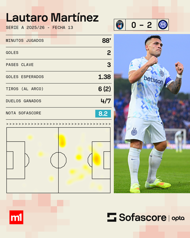 El rendimiento del capitán nerazzurro sostiene su gran temporada. Con los dos tantos ante Pisa, Lautaro llegó a 6 goles en 13 partidos del campeonato italiano, una marca que reafirma su rol como referente ofensivo. A sus números en la Serie A se suman otros cuatro tantos en sus cuatro presentaciones por la Champions League. Sin lugar a dudas que se trata del fiel reflejo del momento que vive en delantero en los últimos años.