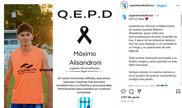 El club Argentino de Alfonzo expresó su dolor con un emotivo mensaje en redes sociales: “Lamentamos informar el fallecimiento de nuestro querido Máximo Alisandroni, quien sufrió una descompensación durante el partido de hoy. A pesar de los esfuerzos médicos, hoy nos toca despedir a un compañero, un amigo y un apasionado de este deporte. Toda nuestra institución acompaña a su familia y seres queridos en este difícil momento”.