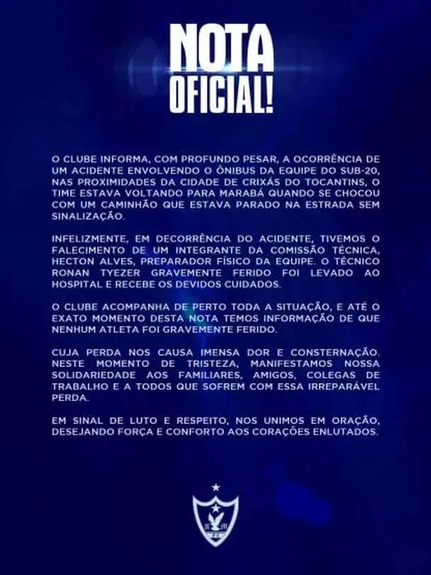 Esa situación habría sido determinante para que el conductor del ómnibus no pudiera evitar el choque, que fue de extrema violencia y dejó el vehículo con severos daños estructurales. La confirmación de la tragedia llegó a través de un comunicado oficial del propio Águia de Marabá, que utilizó sus redes sociales para informar lo sucedido y transmitir su pesar.