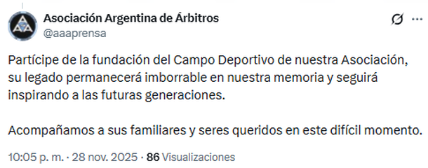 La confirmación oficial llegó este viernes por parte de la Asociación Argentina de Árbitros (AAA). En su cuenta oficial de X, publicaron un mensaje: “Lamentamos informar el fallecimiento de Carlos ‘Coco’ Espósito. Árbitro mundialista (México 1986), con una vasta y reconocida trayectoria nacional e internacional, Fue sin dudas un referente de nuestro arbitraje, además de un gran amigo y compañero”, expresaron en el comunicado.