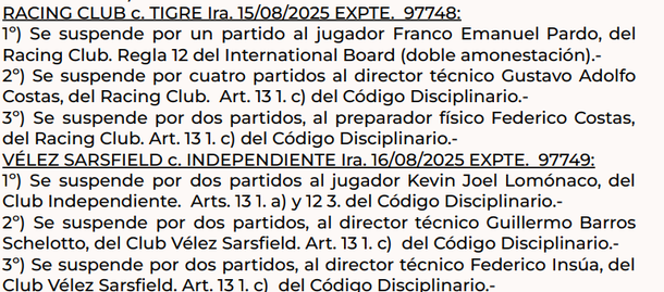 Esta vez no hubo lugar a perdones, y al ser reincidente, el entrenador fue fuertemente sancionado. El Tribunal también comunicó que Guillermo Barros Schelotto recibió dos fechas por su expulsión en la última fecha.