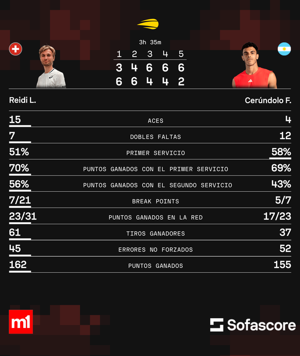Cerúndolo parecía encaminar un triunfo cómodo luego de dominar con claridad los dos primeros sets, con un saque sólido y quiebres tempranos que le dieron confianza. Sin embargo, el suizo reaccionó a tiempo, ajustó su servicio y redujo los errores no forzados, comenzando una remontada que se consolidó con su agresividad en los puntos clave. En el tercer set, Riedi logró el primer quiebre, niveló el encuentro en el cuarto y, ya con la presión completamente de su lado, cerró el quinto set con un imparable winner de derecha que selló una victoria histórica para su carrera.