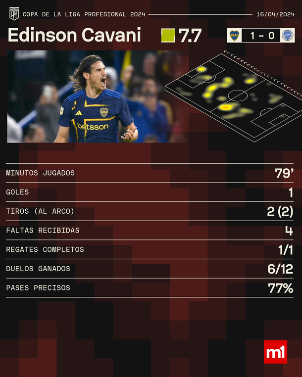 Las estadísticas de Edinson Cavani en el triunfo de Boca ante Godoy Cruz