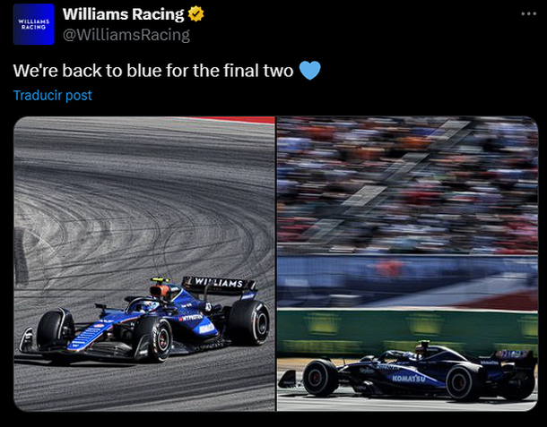 A través de sus redes sociales, la escudería británica confirmó que el cambio será visible en los Grandes Premios de Qatar y Abu Dhabi, los dos eventos que cierran la temporada. "Volvemos al azul para las últimas dos", indicó el equipo en sus publicaciones, mostrando imágenes de los autos modificados de Colapinto y Albon.